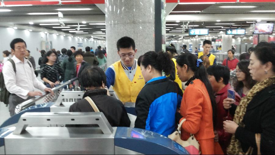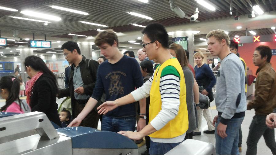 10月25日,虽然北京出现了严重的雾霾天气,但是这全然没有降低学生党员和入党积极分子的热情和积极性。上午8时40分许,同学们到达天安门东站后,受到了站区工作人员的热烈欢迎。经过短暂的工作培训和指导,学生党员便投入到志愿活动当中。