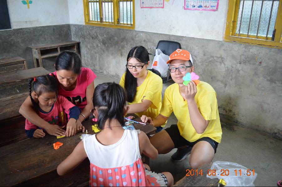 实践团成员带去了漂亮的手工彩纸和一些小文具,手把手地教当地的小朋友彩纸手工制作,与小朋友们共同制作了很多充满温情的手工作品。实践团成员与当地师生的脸上都洋溢着幸福的笑容。教室内不时传出孩子们阵阵歌声与欢笑声。