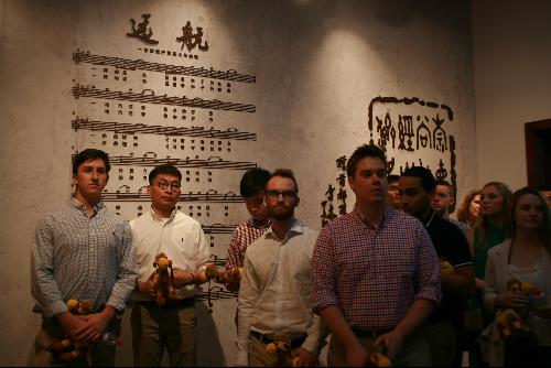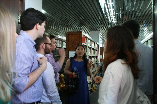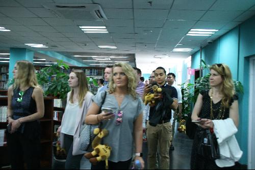 图书馆馆长张学平及管理员曹艳峰老师带领大家了解图书馆构造,认识图书馆布置中运用的中国文化符号以及古典艺术元素,并简要介绍了预约座位和书籍借阅系统。之后,堪萨斯大学师生还参观了我校体育馆和其他教学设施。