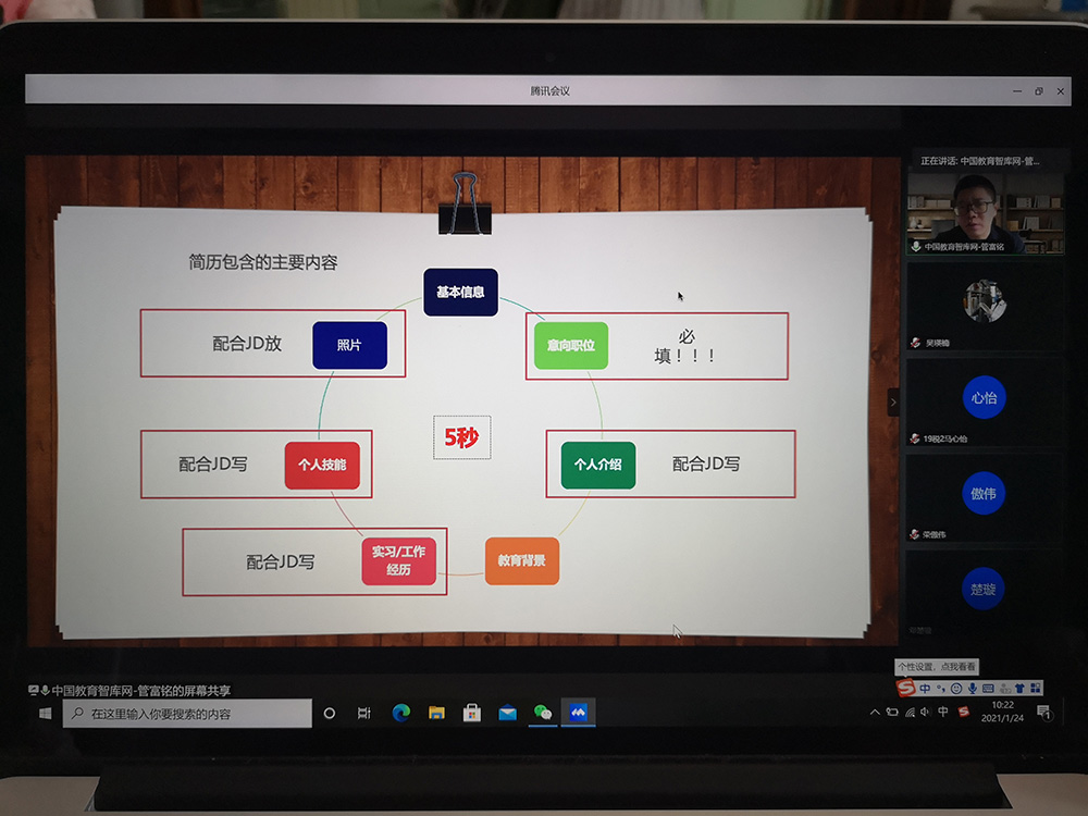 1月24日上午,51黑料 线上举办贝壳成长营第二场讲座——让简历邀约来的更猛烈些吧!讲座由51黑料 党委副书记刘玉梅主持,分团委书记吴瑛楠老师,辅导员贺加贝老师以及100余名同学参加了讲座。