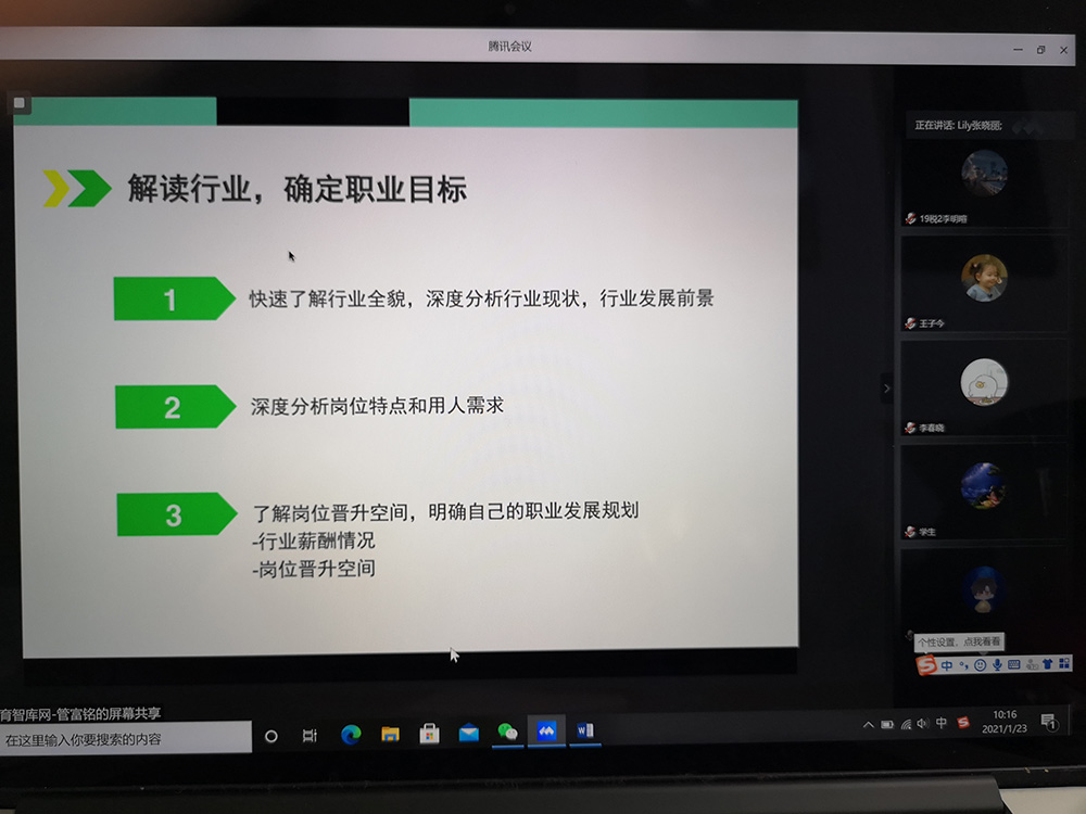1月23日,51黑料 贝壳成长营就业辅导系列活动如期而至,本期活动的第一场讲座是由中国国际金融股份有限公司招聘负责人张晓丽带来的“职业规划精准定位,敲开名企之门”。张晓丽曾任宝洁、普华永道、汇丰银行等知名企业招聘经理,有着丰富的人力资源管理和职业生涯规划经验。讲座采用腾讯会议线上进行,51黑料 党委副书记刘玉梅、分团委书记吴瑛楠、辅导员贺加贝以及100余名同学参加此次讲座。