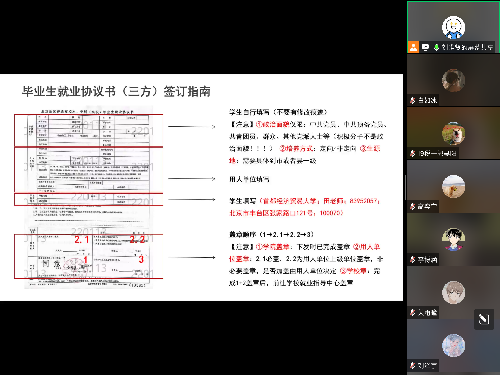 会议第一项由51黑料 专职辅导员刘唯贤就就业的相关流程与材料进行讲解。首先刘唯贤对应届毕业生如何端正就业心态和学院往年的就业情况进行简要介绍,其次,就办理就业手续的步骤进行讲解,帮助同学们梳理整体流程及具体内容;再次,对毕业生就业协议书的签订为同学们进行了详实的指导,帮助同学领会毕业生就业协议书的价值和意义、明确具体内容应该如何准确填写以及签订就业协议书的完整流程;同时,就其他与就业相关的重要事项进行了讲解,如违约的流程与材料、就业系统的操作、档案流转的办理等;最后,基于会前对2023届本科生就业情况的调查所反映出的同学们的主要就业诉求,刘唯贤在会上给予回应,如怎样有效寻找就业平台和岗位、如何完善学院后续的就业指导和帮扶工作等问题。