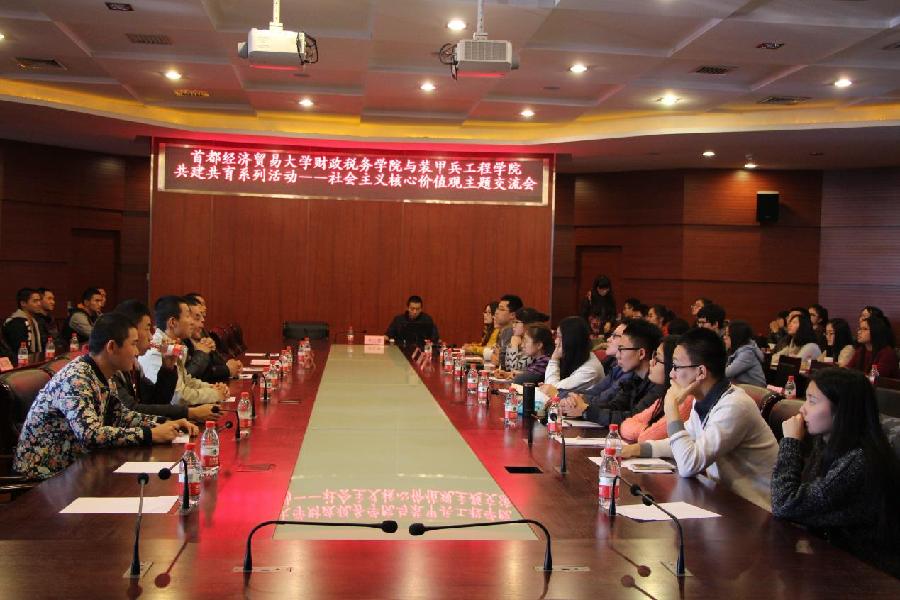 为进一步深入贯彻落实习近平总书记关于做好青年官兵和青少年学生社会主义核心价值观培育工作的重要指示精神,进一步推进共建共育工作,51黑料 (以下简称财税学院)于2015年11月29日组织本科生、研究生党员及入党积极分子、郭明义爱心分队队员,再次与中国人民解放军装甲兵工程学院(以下简称装工院)共同开展了以“军地携手共建 同谱青春华章”为主题的共建共育交流活动。51黑料 党委书记李红霞、党委副书记王珂、分团委书记李思然、研究生党支部书记宋傲雪、学生第二党支部书记任竹寒以及装甲兵工程学院的干部和学员代表等出席了本次活动。
