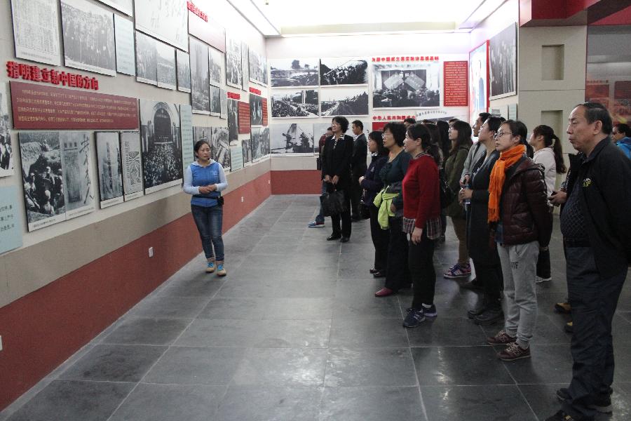 《没有共产党就没有新中国》纪念馆依山就势而建,占地约6000平方米,其中展馆建筑面积1800平方米。纪念馆在巨大的党旗映衬下显得分外庄严和壮观。一行30人在讲解员的带领下集体参观了“历史回响人民心声”、“深山里飞出不朽的歌”、“让心中的歌代代传唱”等大型主题展览。通过对近千张历史图片、浮雕、蜡像、幻影成像、历史文化物质等的参观浏览,了解了《没有共产党就没有新中国》这首歌创作的历史背景、伟大意义和创作条件。再次深刻领会了没有共产党就没有新中国,只有中国共产党才能团结带领人民前进这一历史事实和客观真理。