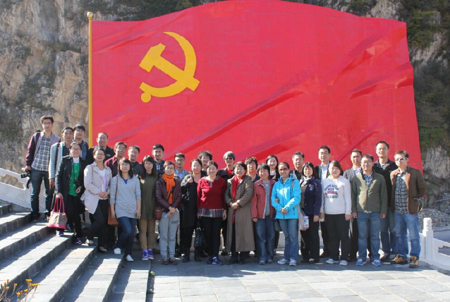 参观结束后,在巨大的党旗下,老党员为校部机关党总支新发展的10名党员佩戴党徽并面对党旗庄严宣誓。随后,在李红霞书记的指挥下大家在巨大的党旗下齐唱《没有共产党就没有新中国》,歌声在山谷间久久回荡。