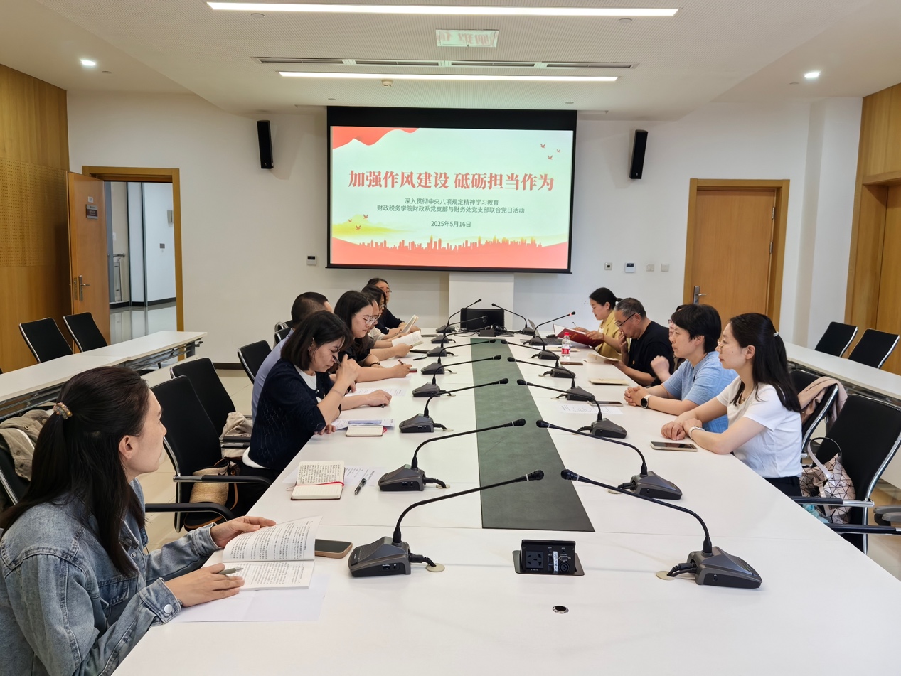 在集中学习环节,与会党员们共同学习了《习近平关于加强党的作风建设论述摘编》,学原文、悟原理。围绕贯彻落实中央八项规定精神,党员们进行了交流发言,财务处党支部林慧婷、滑跃分别从从严加强财务管理,严格执行中央八项规定精神及其实施细则,严肃认真执行财务制度和优化服务,持续改进工作作风,为师生提供优质服务等方面分享了学习体会。财政系党支部李红霞教授提出“破除形式主义需回归教育本质”,强调教师应聚焦教学核心,以课程深度培育学生价值观;青年教师徐军伟结合科研管理实践,倡导以开放思维服务政策创新,推动学术成果向实践转化;青年教师李静从立德树人角度出发,表示将严守纪律底线,以鲜活案例引导学生树立廉洁意识。张馨予表示党员要严格遵守党纪党规,严守纪律红线,确保制度规范落实到位。
