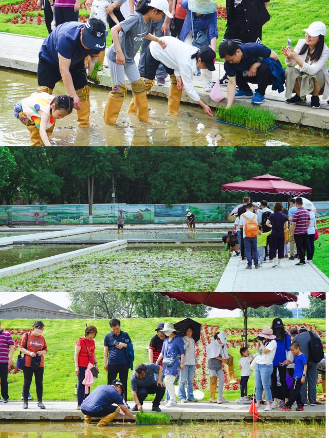 在田间插秧体验环节,老师们在师傅的指导下,带领着小朋友,一字排开、埋头弯腰、左手攥秧把、右手插秧,亲身体验耕田种地的辛苦和乐趣,感受“粒粒皆辛苦”的含义,传承劳动精神。