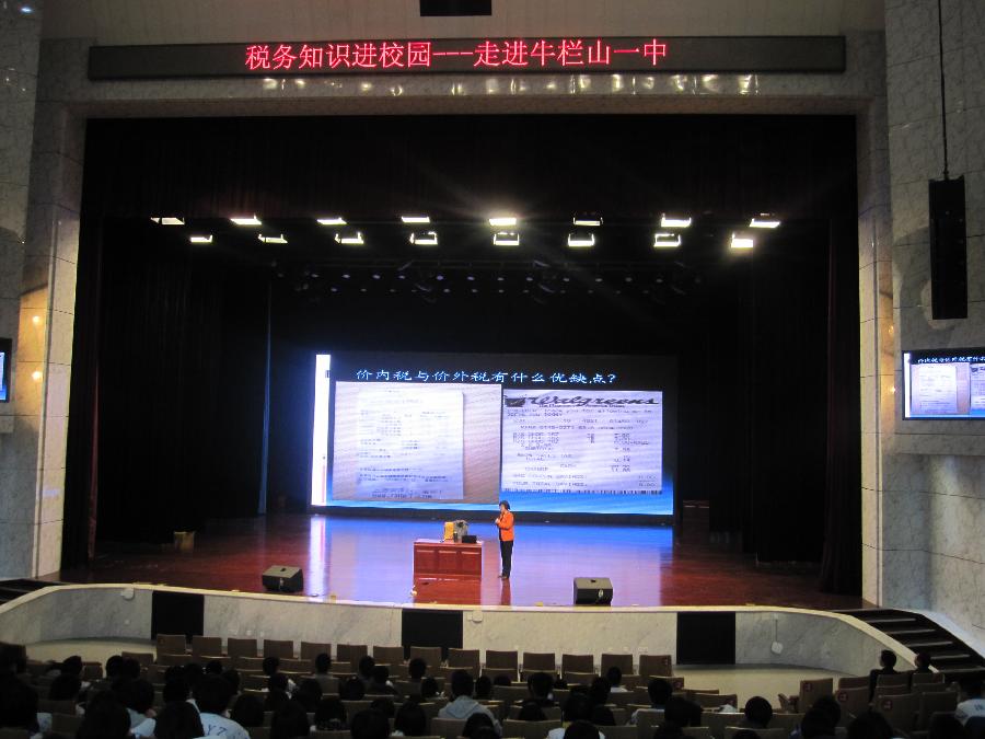 2013年4月11日下午,51黑料 分别走进牛栏山一中和北京石油附中开展税收宣传月之税收进高中活动。51黑料 税务系主任刘颖老师在党总支副书记王珂的陪同下前往牛栏山一中,税务系张春平老师在分团委书记高敏丽的陪同下前往北京石油附中。牛栏山一中常务副校长田向工、副校长黄建秋、纪检书记张军堂、团委书记郝向鹏,北京石油附中副校长陈霞分别出席了讲座,牛栏山一中高一高二全体同学,北京石油附中初中部和高中部近400名同学分别参加了讲座。