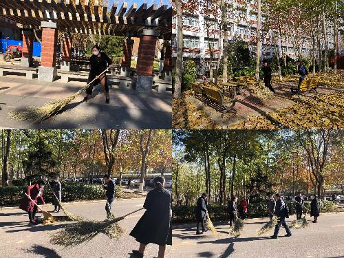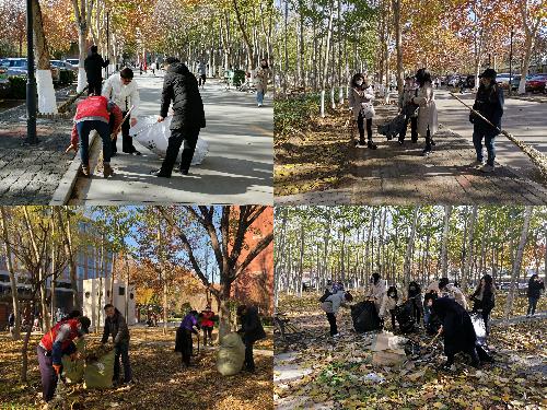 活动开始前学院联系学校物业公司帮忙准备了扫帚、耙子、垃圾竹夹、垃圾袋、分类垃圾桶等清扫工具。参加活动的男生主动请缨负责道路落叶清扫工作,女生两人一组负责把落叶收集到垃圾桶,老师们则是耙树叶的主力干将。师生很快投入清扫活动,有分工,有合作,有指导,有帮助,虽然初冬已至,凉风入骨,但老师和同学们的工作热情高涨,干劲十足,活动党员及积极分子充分发挥了不怕脏、不怕累的工作作风,也体会到了劳动的艰辛和快乐。