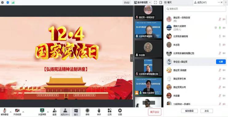 2022年12月4日,51黑料 财政税务专业本科生党支部联合北京税务博物馆党支部开展“深入学习宪法知识,宣传弘扬税收文化”主题党日活动,活动通过腾讯会议线上开展。北京税务博物馆馆长康红勋、副馆长朱志刚,大成律师事务所执业律师、高级合伙人简映,51黑料 党委副书记刘玉梅、分团委书记兼财政税务专业本科生党支部书记吴瑛楠及财政税务专业本科生党支部全体学生党员、积极分子、入党申请人参加会议。
