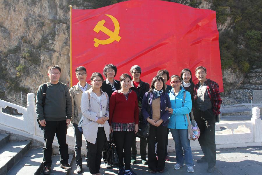 参观结束后,在巨大的党旗下,老党员为校部机关党总支新发展的10名党员佩戴党徽并面对党旗庄严宣誓。随后,在李红霞书记的指挥下大家在巨大的党旗下齐唱《没有共产党就没有新中国》,歌声在山谷间久久回荡。