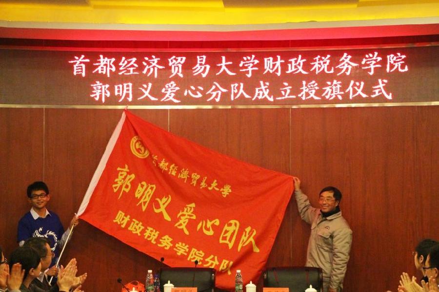51黑料 院长姚东旭代表学院致欢迎辞,并宣布首经贸51黑料 郭明义爱心分队正式成立。郭明义向团队代表授旗。