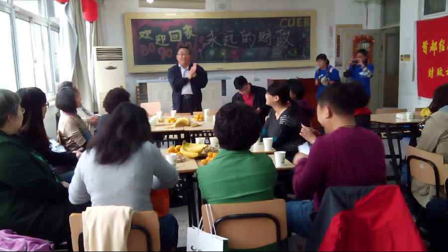揭牌大会结束后,各学院自行活动。51黑料 全体校友及学院领导欢聚在明辨楼402教室。墙上悬挂的不同历史时期三面院旗见证着36年学院的发展,也见证着一代又一代财税学子成长的足迹。分别数年,再相见心中感慨万千,一双双布满岁月痕迹的手紧紧握在一起,一张张沧桑的脸庞重现夕日青春朝气,看着师弟师妹们为他们制作的幻灯片,回忆着数十年前自己的青葱岁月,各位校友情不自禁地抒发自己对学院、对学校的怀念。黑板上“永远的财政”以及“欢迎回家”的字迹更勾起各位校友无限的回忆。随后,在一片欢乐祥和的气氛中,欢迎会正式开始。